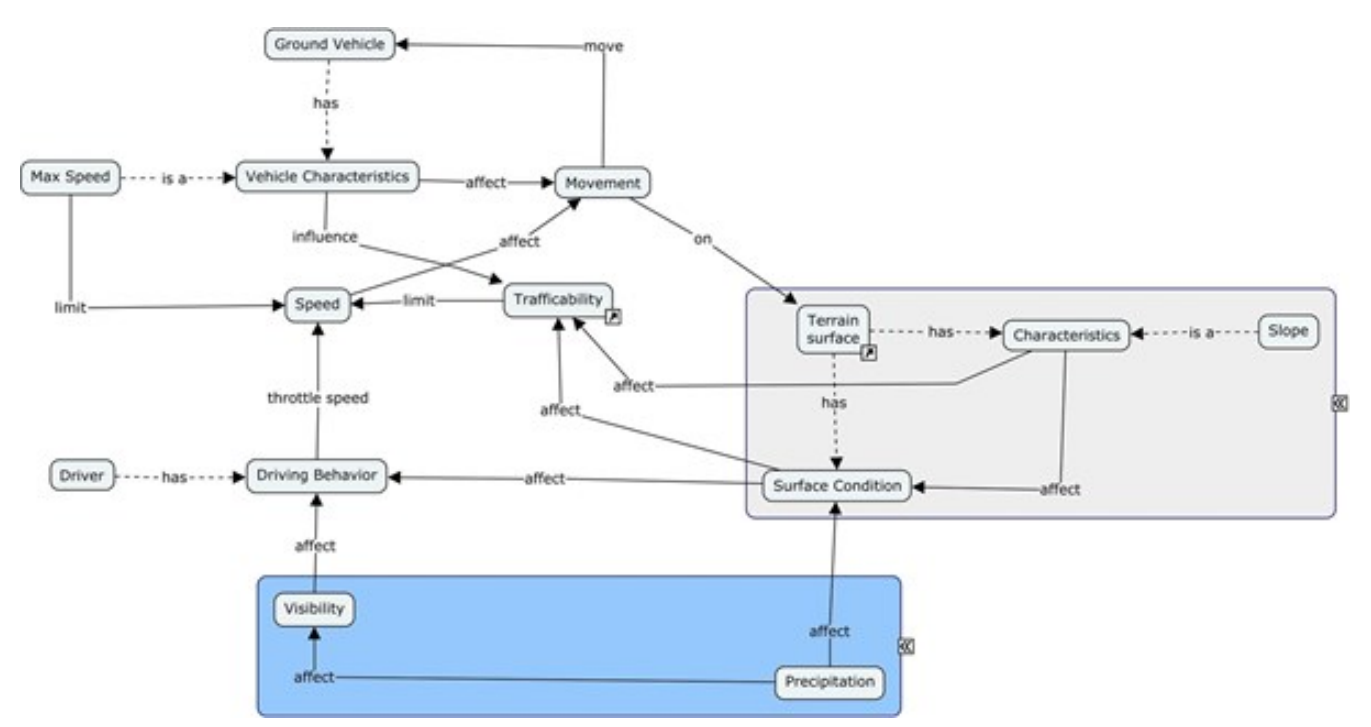 图 3-5:地形和天气对车辆通行性影响的概念模型图