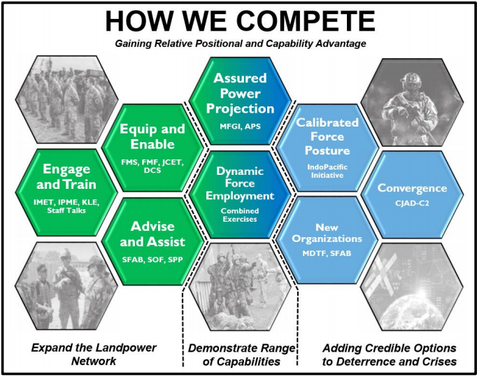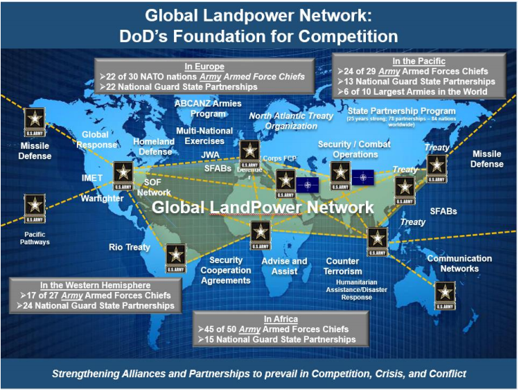 在竞争中,陆军坚持通过培养一个强大的盟友和合作伙伴网络来建立相对位置优势。这个全球陆军网络是国防部的竞争基础,为联合和整个政府的战略参与创造了突破口和机动空间。