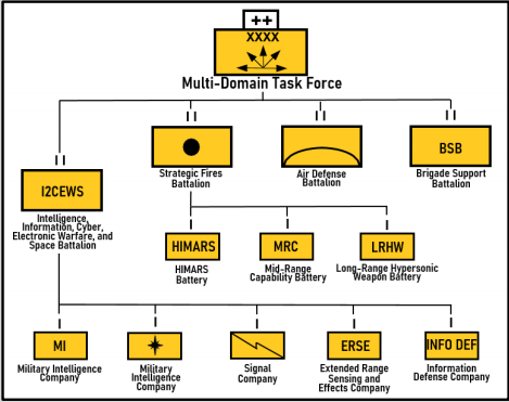 陆军已经开发了多域实验的组织核心--多域任务组(MDTF)。多域特遣部队-1总部设在华盛顿州的刘易斯-麦克乔德联合基地,隶属于美国太平洋陆军,是这些部队中第一个将多域能力带给作战指挥官的部队。多域特遣部队的全域作战中心(ADOC)目前正在建设中,它将能够对所有领域的对手接触进行全天候监督。下一页将更详细地讨论MDTF的情况。