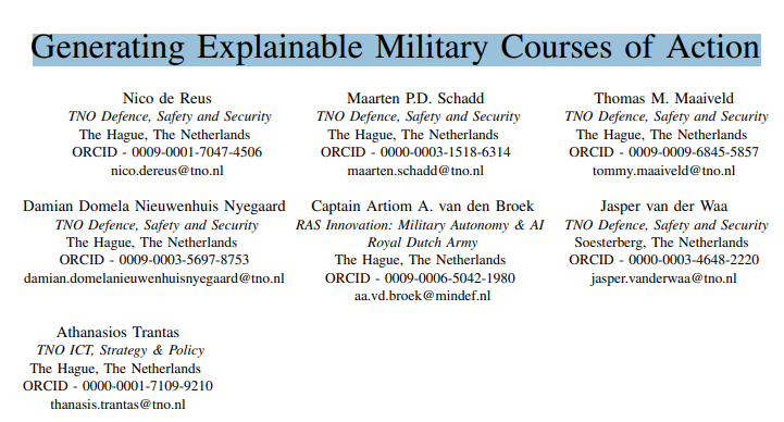 有了这种决策支持工具,指挥官就有可能无法完全理解所建议的任务和计划的动机和细节。因此,必须特别注意对自动生成的计划进行解释。因此,我们将深入探讨(人工智能)自动化如何支持行动方案的制定,以及如何以军事规划流程参与者可理解和熟悉的方式解释所选的行动方案。