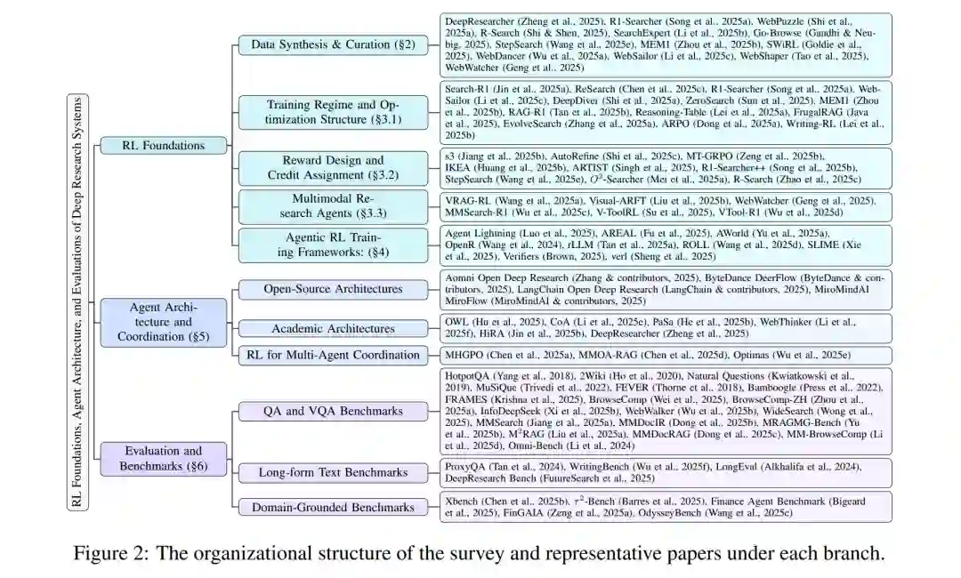 深度研究系统(deep research systems)指能够通过整合推理、开放网络与用户文件的检索、以及工具使用来解决复杂多步任务的智能体型人工智能(agentic AI)。此类系统正逐步演化为分层化的部署架构,包括 规划器(Planner)、协调器(Coordinator) 和 执行器(Executors)。在实践中,将整个堆栈进行端到端训练仍不切实际,因此大多数研究仅针对单一规划器进行训练,并将其连接到核心工具(如搜索、浏览与代码)。 监督微调(SFT)虽然能赋予协议一致性(protocol fidelity),但它存在模仿偏差与暴露偏差,同时未能充分利用环境反馈。基于偏好的对齐方法(如 DPO)则依赖于特定的模式(schema)和代理(proxy),属于离策略(off-policy)范式,在长时程信用分配和多目标权衡上表现不足。SFT 与 DPO 的另一局限在于它们过度依赖人工预定义的决策点与子技能,例如模式设计和标注比较。 相比之下,强化学习(RL)天然契合闭环的、包含工具交互的研究过程。它能够优化轨迹层面的策略,支持探索、恢复行为以及有原则的信用分配,从而减少对人工先验与标注者偏见的依赖。 据我们所知,本综述是首个专门针对深度研究系统中强化学习基础的系统化研究。我们沿三个维度对 DeepSeek-R1 之后的工作进行了梳理与归纳:(i)数据合成与筛选;(ii)面向研究型智能体的强化学习方法,包括稳定性、样本效率、长上下文处理、奖励与信用设计、多目标优化以及多模态集成;(iii)智能体型强化学习的训练系统与框架。我们还讨论了智能体架构与协作机制,以及评测与基准任务,包括最新的问答(QA)、视觉问答(VQA)、长篇综合生成和具备领域约束的工具交互任务。最后,我们总结了反复出现的研究模式,指出了基础设施瓶颈,并提供了实用性建议,以推动利用强化学习训练出健壮且透明的深度研究智能体。 我们整理的相关论文清单可在 GitHub 获取:github.com/wenjunli-0/deepresearch-survey。