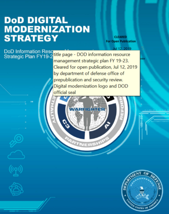 AI [人工智能]正在迅速改变广泛的企业和行业。它还将改变未来战场的特征和我们必须面对的威胁的速度。我们将利用人工智能的潜力,积极转变国防部的所有职能,从而支持和保护美国军人,保护美国公民,保卫盟友和合作伙伴,并提高我们行动的经济性、有效性和速度。美国武装部队中的男女官兵仍然是我们持久的力量源泉;我们将利用人工智能化的信息、工具和系统来增强而不是取代服役人员的能力。(2018年摘要,第4页)