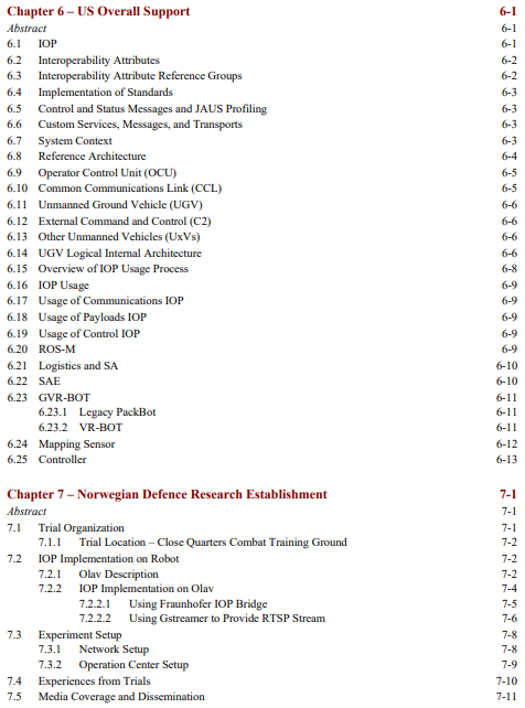 这两项工作都使用了无人系统联合架构(JAUS)和互操作性配置文件(IOP),以成功实现系统间的互操作性。试验表明,有可能相当容易地扩展系统,并在相对较短的时间内实现与部分标准的兼容。弗劳恩霍夫FKIE和TARDEC都开发了软件,将信息从IOP域传递到机器人操作系统(ROS),并从该系统中获取信息。ROS是一个广泛使用的软件,用于开发UGV和其他类型机器人的自主性,并被该小组的许多合作伙伴所使用。Fraunhofer FKIE和TARDEC提供的软件对试验的成功至关重要。