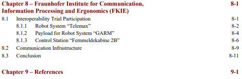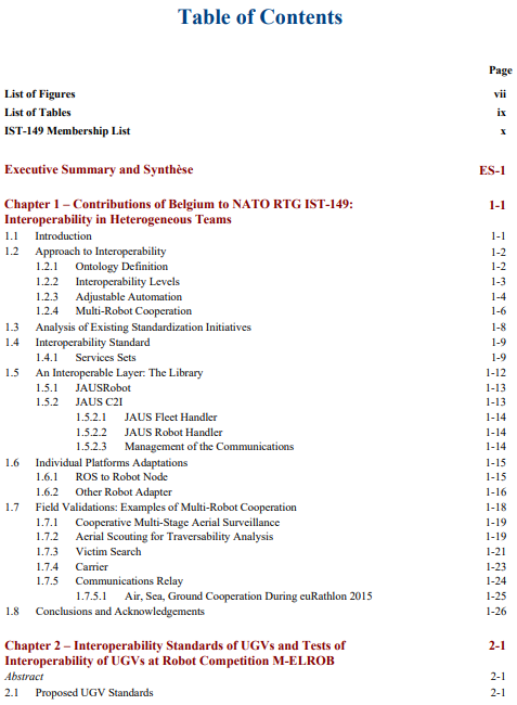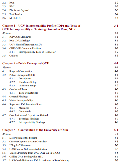 本报告描述了北约STO RTG IST-149无人地面系统和C2内互操作性能力概念演示器的研究和实验工作。无人地面车辆(UGVs)在现代战斗空间中正变得越来越重要。这些系统可以携带大量的传感器套件,从前线提供前所未有的数据流。另一方面,这些系统在大多数情况下仍然需要远程操作。重要的是要认识到,如果没有适当的方式在联盟伙伴之间交换信息和/或将其纳入C2系统,ISR数据在很大程度上将是无用的。该小组的主要目的是找到改善这种情况的方法,更具体地说,调查从操作员控制单元(OCU)控制UGV和接收数据的可能标准,并在现实世界的场景中测试它们。
