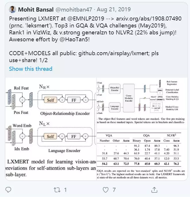 视觉和语言推理需要理解视觉概念、语言语义,最重要的是理解这两种模式之间的对齐和关系。因此,我们提出了LXMERT(从Transformers中学习跨模态编码器表示)框架来学习这些视觉和语言联系。在LXMERT中,我们构建了一个大型Transformers模型,它由三个编码器组成:一个对象关系编码器、一个语言编码器和一个跨模态编码器。接下来, 赋予我们的模型的功能连接视觉和语言的语义,我们在大量image-and-sentence 预训练模型, 通过五个不同代表训练的任务: mask语言建模,mask对象预测(功能回归和标签分类), 跨模式匹配和图像问答。这些任务有助于学习模态内和模态间的关系。从我们预先训练的参数进行微调后,我们的模型在两个可视化的问题回答数据集(即, VQA和GQA)。我们还通过将预训练的跨模态模型应用于具有挑战性的视觉推理任务NLVR2,并将之前的最佳结果提高了22%(54%至76%),从而展示了该模型的通用性。最后,我们展示了详细的ablation study,以证明我们的新模型组件和预训练策略对我们的结果有显著的贡献;并针对不同的编码器提出了几种注意可视化方法。代码和预训练的模型可在: https://github.com/airsplay/lxmert