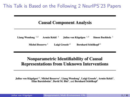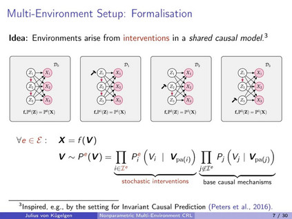 我们研究因果表示学习,即从高维变量混合中推断潜在因果变量及其因果关系的任务。先前的工作依赖于弱监督,以反事实干预前后视图或时间结构的形式;对混合函数或潜在因果模型提出限制性假设,如线性;或需要对生成过程有部分知识,如因果图或干预目标。相反,我们考虑一个一般性设置,在该设置中,因果模型和混合函数都是非参数的。学习信号采取多个数据集或环境的形式,这些数据集或环境源于潜在因果模型中未知干预的结果。我们的目标是识别出基本真实的潜在因素及其因果图,直到一组我们证明无法从干预数据解决的模糊性。我们研究了两个因果变量的基本设置,并证明观测分布和每个节点一个完美干预就足以确定性识别,前提是一个通用性条件。该条件排除了涉及干预和观测分布的微调的伪解,反映了类似于非线性因果-效应推断的相似条件。对于任意数量的变量,我们显示每个节点至少一对不同的完美干预领域保证了确定性识别。此外,我们展示了所有等效解决方案保留了潜在变量间因果影响的强度,使得推断出的表示适合从新数据中得出因果结论。我们的研究为带有未知干预的一般非参数设置提供了首个确定性识别结果,并阐明了在没有更直接监督的情况下,因果表示学习可能与不可能的事项。