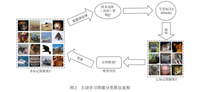 在早期研究中,文献[10]将目前主动学习方法定 义为三种基本框架:基于成员查询的主动学习、基于流 的选择性采样和基于池的主动学习 . 基于成员查询的 主动学习方法是指学习器可以请求查询输入空间中任 何未标记样本的标签,包括学习器生成的样本. 基于流 的选择性采样是指每次从未标记数据源中提取一个样本数据,学习器必须决定是查询标签还是丢弃该数据. 基于池的主动学习框架则维护一个未标注数据集合, 由样本选择策略从未标记集合中选择要标注的样本. 目前,基于池的主动学习框架更适用于图像分类 任务中. 该框架能同时处理批量数据,从未标记数据集 中选出对模型训练最有帮助的数据进行标注,提高标 注数据效率,降低成本 . 此外,该框架适用于数据集规 模较大、标注数据较少的情况,符合多数图像分类技术 场景. 相比之下,基于成员查询的主动学习算法需要逐 个查询成员并进行标注,不适用于大规模的数据集. 基 于流的选择性采样在处理流数据时,对每个数据点进 行快速分类来实现快速标注,从而处理大量的数据流. 但在图像分类中,每个数据点都是一个独立的图像,对 每个图像进行分类和标注可能会带来更多的标注成 本,因此该方法在图像分类中使用较少. 该方法主要适 用于需要时效性的小型移动设备的应用场景,因为这 些小型设备通常具有有限的存储和计算能力 . 图 1 展 示了基于池的主动学习的基本框架.
