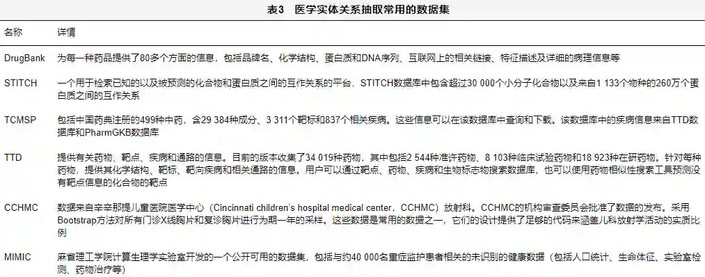 医学实体关系抽取较常用的数据集主要有以下几种,见表3。