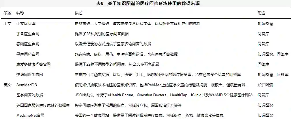(1)实现方法 本文参考了近3年的研究进展,总结出医疗领域基于知识图谱的问答系统主要有两种实现方法:检索式和生成式。其中,检索式主要面向系统构建的知识图谱,生成式主要面向系统收集的问答库数据,表8列出了可用于构建基于知识图谱的医疗问答系统的数据来源。