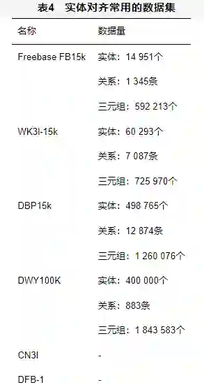 实体对齐较常用的数据集主要有以下几种,见表4。