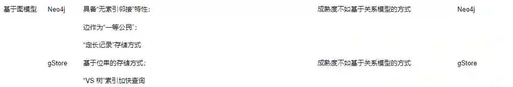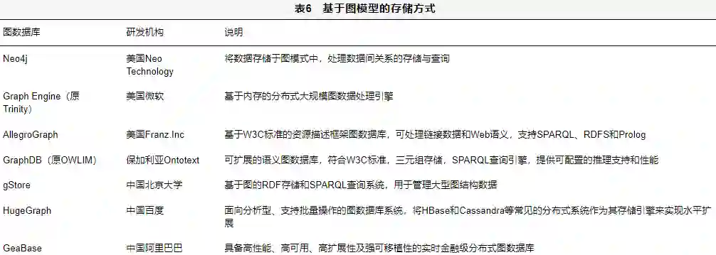 现有知识图谱数据的存储方式主要分为两种:基于关系模型的存储方式和基于图模型的存储方式。 基于关系模型的知识图谱存储方式包括三元组表、水平表、属性表、垂直划分、六重索引和DB2RDF。 目前,基于图数据库的知识图谱存储方法是学术界研究的主流。图数据库的优点在于其天然能表示知识图谱结构,图中的节点表示知识图谱的对象,图中的边表示知识图谱的对象关系。其最大的优点是可以用来处理复杂的关系问题,提供完善的图查询语言,支持各种图挖掘算法。采用图数据库存储知识图谱,能有效利用图数据库中以关联数据为中心的数据表达、存储和查询。基于图模型的存储方式见表6。