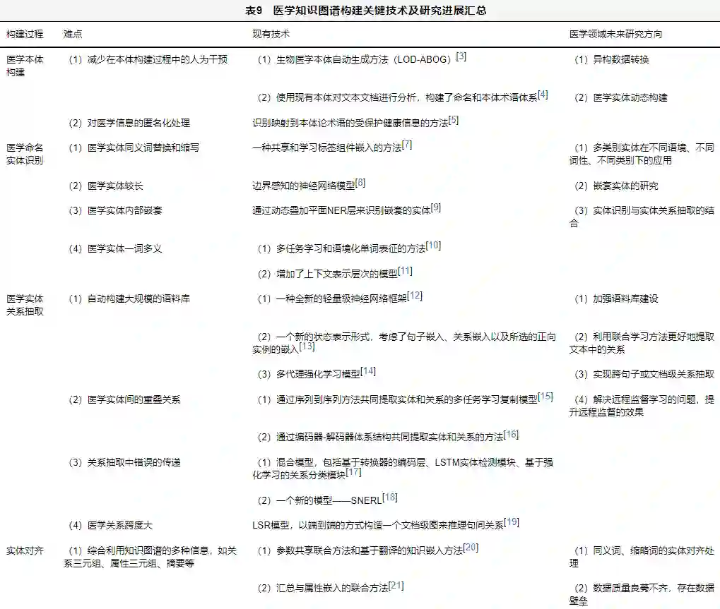 医学知识图谱在用药推荐系统应用领域的未来研究方向主要有以下几方面。 ① 构建完整的医学知识图谱。人类对疾病与药品的认识是动态变化的,结合疾病、症状、药品、药品间的相互作用及患者的临床数据、患病的时间序列信息等,构建一个完整的医学动态知识图谱,确保知识的完整性、准确性和时效性。 ② 知识图谱嵌入学习是将实体和关系映射到低维连续向量空间的表示方法,在保留知识图谱结构信息的同时,还能够改善数据稀疏问题,提高计算效率,因此在进行后续用药推荐任务之前,先对知识图谱进行表示学习是很有必要的。 ③ 考虑到构建动态医学知识图谱的必要性,而目前大多数知识嵌入表示研究建立在静态的知识图谱上,如何对动态知识图谱进行有效的知识表示是一个待解决的问题。将图时空网络与动态知识图谱相结合的知识嵌入表示用于用药推荐是一个颇具价值的研究方向。 9 医学知识图谱未来展望 构建医疗领域的知识图谱,可以从海量数据中提炼出医疗知识,并合理高效地对其进行管理、共享及应用,这对当今的医疗行业具有重要意义,也是很多企业和研究机构的研究热点。本文对医学知识图谱构建过程中的研究热点、现有技术、挑战及未来发展方向进行了综述,具体见表9。医学知识图谱将知识图谱与医学知识结合,定会推进医学数据的自动化与智能化处理,为医疗行业带来新的发展契机。医学知识图谱未来总的发展方向应该体现以下几个方面。