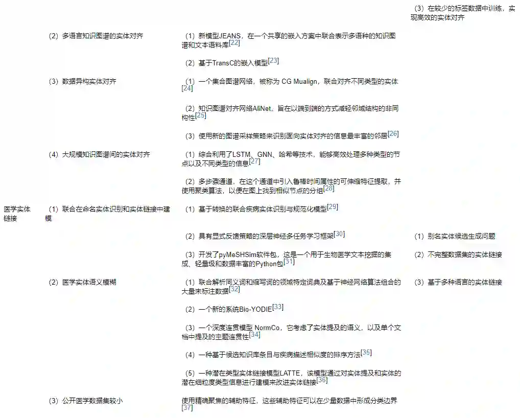 (2)不完整数据集的实体链接 在实体链接中,实体、实体的类别信息、关系信息以及上下文信息对实体对齐非常重要,医学数据经常存在数据不完整的情况,使得实体链接效果不是很好,通过仅有的实体相关信息进行链接是医学领域实体对齐面临的又一大挑战。