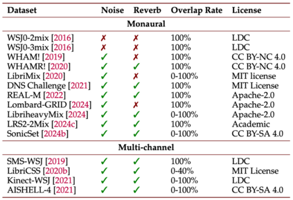 数据集 公开数据集为语音分离研究提供了标准测试,他们按照单通道和多通道对主流数据集进行了总结。通过对数据集的梳理,研究者可以了解各数据集所覆盖的场景和难度,有助于选择合适的数据集来评估算法并发现当前研究还未覆盖的场景(例如更长时段对话、开放域噪声环境等),从而指导未来数据收集和模型开发。