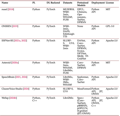 为了推动研究复现和应用落地,综述还介绍了当前常用的开源工具和平台,这些软件库为语音分离任务提供了便利的开发接口和训练框架。对比了各工具的功能侧重点,例如有的注重学术研究易用性,有的侧重工业优化和实时性能,也指出了当前工具链存在的局限,如对最新算法的支持仍需跟进等。通过了解这些平台,研发人员可以更高效地复现论文结果、搭建原型系统,加速从研究到应用的转化。