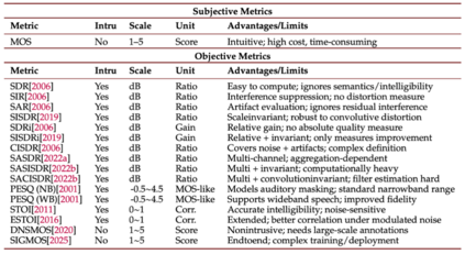 评估指标 评价语音分离效果需要科学全面的指标体系,以便衡量模型性能、指导算法优化并确保满足实际应用需求。该综述将评估指标分为主观和客观两大类。综述对比了各种指标的优劣:主观评价贴近人耳体验但难以大规模获取,客观指标高效客观但各自侧重不同方面,需要结合使用。综合运用主客观评价能够更完整地刻画语音分离系统的性能,为研究和应用提供可靠依据。