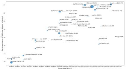 他们汇总了不同模型在各标准数据集上的分离性能对比,勾勒出语音分离技术近年来的进步轨迹。作者列举了众多具有代表性的模型在若干公开基准上的评测结果,并通过图表展示性能随时间的提升趋势。 例如,在经典数据集 WSJ0-2mix 上,早期模型(如 DPCL、uPIT-BLSTM 等)能达到约 10 dB 的 SDR;随后基于深度学习的端到端模型(如 Conv-TasNet)将性能推升到 12 dB 以上;最近两三年的先进架构(如 SepFormer、DPRNN 系列、双路 Transformer 等)更是将 SDR 提升到 20 dB 左右,接近定量评测所能达到的上限。这些结果直观证明了架构创新和训练范式改进对分离效果的巨大推动作用。 不仅如此,综述还比较了模型在不同数据集上的表现差异:例如在含噪声混响的 WHAM! 和 WHAMR! 上,模型性能相对无噪条件下降明显,说明噪声鲁棒性仍是挑战;这种多维度的结果对比帮助读者了解各类方法的优势和局限:有的模型在干净近场语音下接近完美,但在远场或噪声场景下性能下滑;有的方法擅长分离两三人对话,但扩展到更多说话人时代价巨大。通过统一的结果汇总与分析,作者提供了对当前最先进技术水平的客观评估,并据此指出了亟待攻克的薄弱环节。