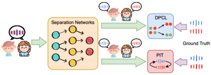 学习范式 作者们分类总结了学习范式,比较了不同方法的适用场景和优缺点,为读者理解监督与非监督方法在语音分离中的权衡提供了清晰脉络。重点对比了有监督和无监督(含自监督)学习方法。有监督学习利用配对的混合音频及纯净源音频进行训练,是目前最成熟的范式。针对有监督训练中不同源输出无法一一对应的标签置换问题,研究者提出了两类经典方案: 一是深度聚类方法(DPCL),通过神经网络将混合语音的时频单元映射到高维嵌入空间,再将嵌入向量聚类以生成每个声源的掩膜,从而避免直接输出固定顺序的源信号; 二是 Permutation Invariant Training(PIT)方法,在训练时对网络输出的来源标签进行动态匹配,只保留误差最小的排列来更新模型,从而使网络学习到与输出排列无关的分离能力。