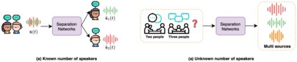 问题定义 作者们从语音分离领域的宏观角度出发,根据混合说话人数量是否已知将已知人数分离和未知人数分离两类。当说话人数固定且已知时,网络输出固定个数的通道,可以通过深度聚类 (Deep Clustering) 或 Permutation Invariant Training(PIT,排列不变训练)等策略解决输出顺序不确定的 “排列歧义” 问题。对于未知人数的情况,模型需要动态决定输出通道数并判断何时结束分离。这带来巨大挑战:如说话人排列组合随人数增加呈指数扩展、需要在分离质量与终止时机之间权衡避免欠分离或过分离等。为应对这些问题,研究者提出了递归分离、动态网络等框架来逐步提取不定数量的声源。作者们从问题定义部分明确了语音分离任务的目标和难点,为后续技术讨论奠定了基础。