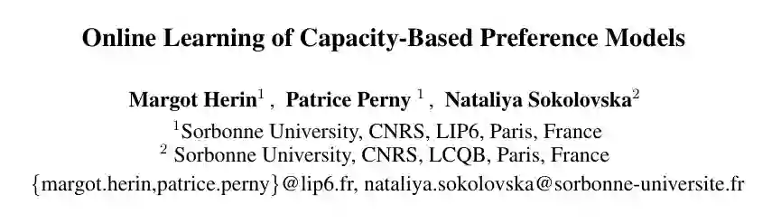 论文地址:https://www.ijcai.org/Proceedings/2024/0366.pdf 在本文中,我们提出使用认知依赖来表达控制查询评估(Controlled Query Evaluation, CQE)中的数据保护策略。CQE是一种在本体和数据库上进行保密查询回答的形式。我们提出的策略语言显著超越了现有文献中关于CQE的提案,允许非常丰富且具有实际意义的数据保护规则。我们展示了该框架的表达能力,并研究了当本体在描述逻辑DL-Lite(_R)中指定时,(联合)连接查询的CQE数据复杂性。值得注意的是,尽管我们表明该问题总体上是不可处理的,但我们通过提供一个合适的查询重写算法,证明了对于非循环认知依赖的情况是可处理的。这一结果为该新CQE方法的实现和实际应用铺平了道路。论文3:《Online Learning of Capacity-Based Preference Models》,专注于基于容量的偏好模型的在线学习。