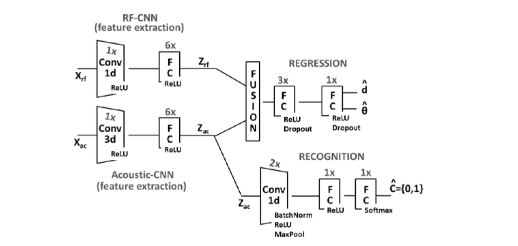 最近,深度学习(DL)和深度神经网络(DNN)研究领域的发展所带来的计算和性能上的进步,促进了文献中无人机识别算法的增加,如[8,9,10]。特别是,已经证明主要由螺旋桨、马达和机体的机械振动产生的综合声学信号具有足够独特的特征,可以用来在现实的开放世界条件下在一些无人机类别中识别无人机类型。DL和DNN也被研究用于涉及多通道声学处理的各种应用,如[11,12]和[13]中,多通道频谱相位信息被用作卷积神经网络(CNN)的输入,用于DOA估计。在我们的研究中,一个基于CNN的四级网络的算法的性能被引入到识别和定位任务中。两个平行阶段处理射频数据和声学数据的内在特征。第三阶段进行声源识别,第四阶段进行回归。这种算法既能产生无人机识别,又能对DOA和与声源的距离进行联合预测。本文对这一研究的现状进行了讨论。