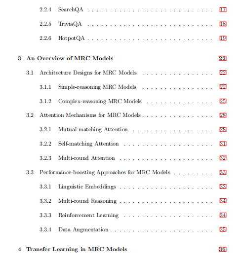 为了提供对机器阅读理解(MRC)中现有任务和模型的调查,本报告回顾:1)一些具有代表性的简单推理和复杂推理MRC任务的数据集收集和性能评估; 2)用于开发基于神经网络的MRC模型的体系结构设计,注意机制和提高性能的方法; 3)最近提出了一些转移学习方法,以将外部语料库中包含的文本样式知识合并到MRC模型的神经网络中; 4)最近提出的一些知识库编码方法,用于将外部知识库中包含的图形样式知识合并到MRC模型的神经网络中。 此外,根据已经取得的成就和仍然存在的不足,本报告还提出了一些尚待进一步研究的问题。