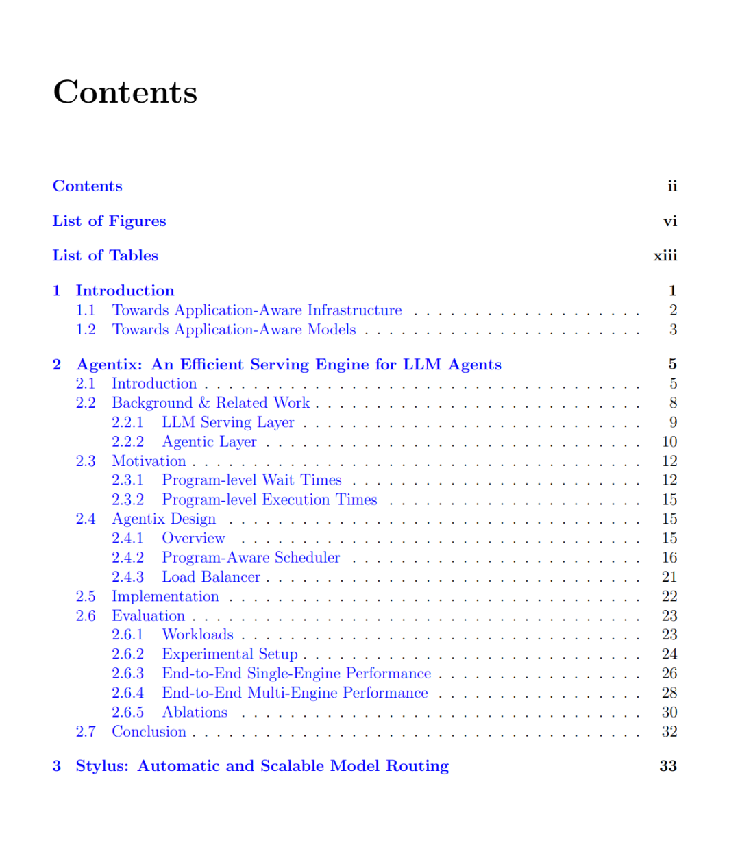 大型语言模型(Large Language Models,LLMs)在多样且复杂的任务上展现出了卓越能力,但前沿模型与成千上万具有领域特定需求的下游 AI 应用之间,仍然存在着一种根本性的解耦。这种割裂同时限制了性能与效率:模型的训练与服务过程并未考虑下游应用的具体需求。 在本论文中,我们设计了一系列系统与算法,将模型层与应用层进行紧密耦合,从而推动应用感知(application-aware)的基础设施与模型发展。首先,我们提出了三种面向应用感知基础设施的系统,用以优化成本与性能。Agentix 是一种推理服务引擎,它为 AI 智能体引入了应用感知的调度机制。通过跟踪 LLM 调用之间的依赖关系并利用应用层统计信息,Agentix 相较于 vLLM 等最先进系统,在端到端响应时间上实现了 4–15 倍的提升,从而显著降低了成本。接下来,Stylus 是一种可扩展的模型路由器,能够从超过 10 万个 LoRA 适配器中检索并组合最优适配器,从而在性能上超越基础版 Stable Diffusion。最后,Starburst 是一种面向混合云机器学习基础设施的成本感知调度器,它根据作业特性动态分配等待时间,在保持极低作业完成时间的同时,将云端成本最高降低 91%。 随后,我们进一步表明,通过强化学习(Reinforcement Learning,RL)将模型与应用进行耦合,能够同时实现更高性能与更低成本。借助 Agentica Project,我们展示了经由应用特定强化学习训练的小模型,能够以远低于前沿模型的成本达到相当的性能水平。DeepScaleR 是一个 15 亿参数的模型,仅使用 3,800 GPU 小时便在数学推理任务上超越了 o1-preview,相较以往方法实现了 18 倍的成本降低。DeepCoder 使用一个 140 亿参数模型,在竞技编程任务上达到了 o3-mini 级别的性能。最后,DeepSWE 训练了一个 320 亿参数的最先进自主编程智能体,其性能相比所有先前的开源智能体提升了超过 12 个百分点。 总体而言,这些工作为应用开发者与各类组织民主化了对前沿级 AI 能力的获取,使高性能、低成本的 AI 系统构建成为可能。