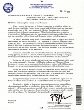 五角大楼宣布全面革新政策,旨在加速全美武装部队部署小型无人机(含武装型号)。最显著的是,特定类别小型无人系统(UAS)现被列为"消耗品",更接近手榴弹等弹药而非航空器,这引发广泛连锁反应。低级指挥官现可直接采购小型无人机系统,并授权下属操作。推出的新政策代表较大转变。