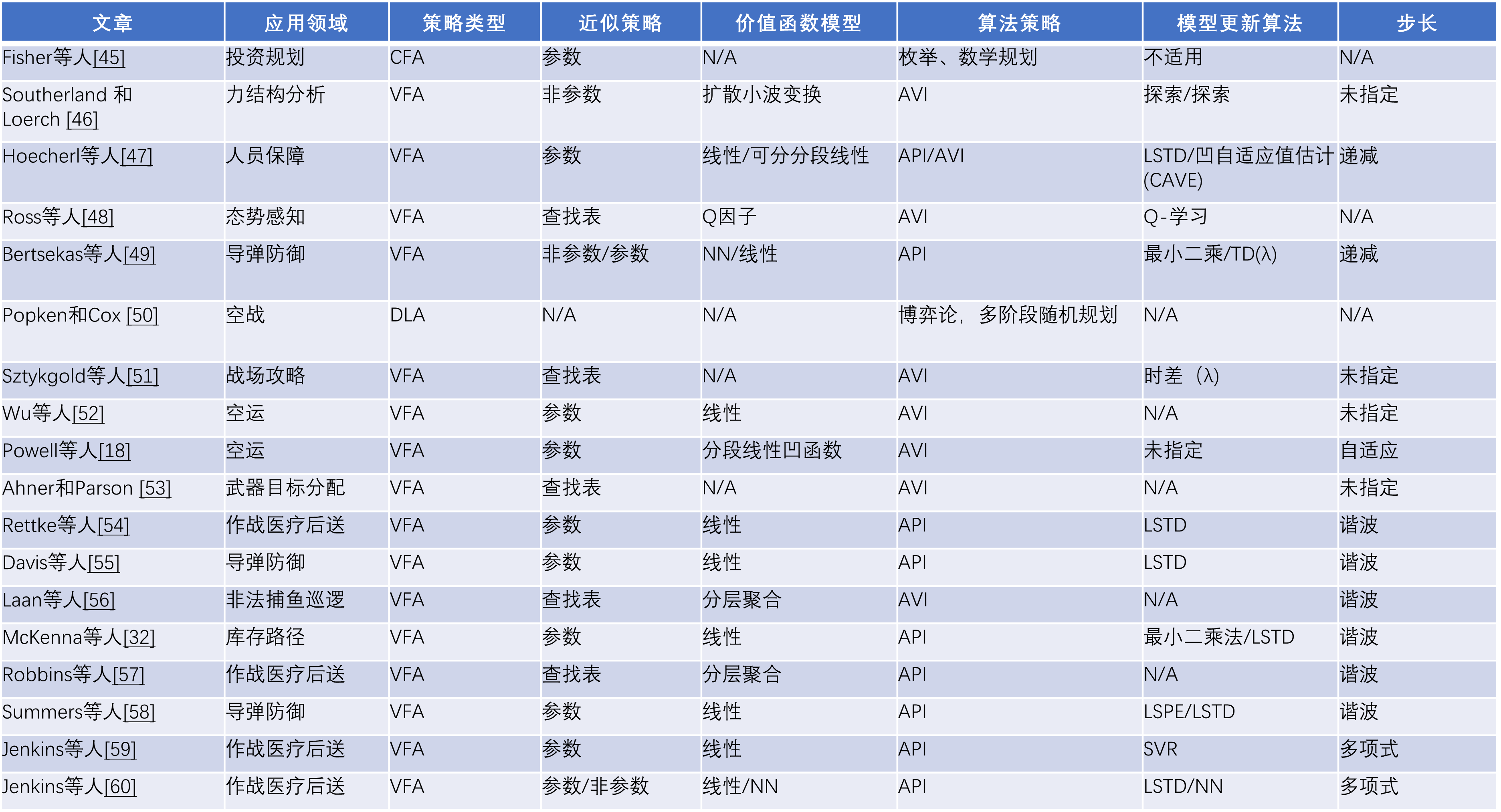 在本节中,我们介绍了通过上述文献搜索确定的18篇基于应用的文章的摘要。表2列出了每项研究,其应用领域,以及所实施的ADP策略和算法的特征。所列的特征主要集中在第2.3节中讨论的那些特征,即: