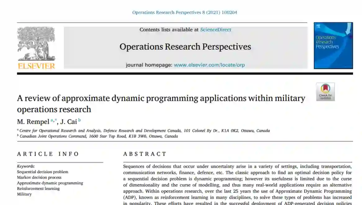 在这篇文章中,我们首次回顾了ADP在国防背景下的应用。特别是,我们专注于军事运筹学领域的同行评议文献;也就是 "应用定量分析技术为军事[或民事]决策提供信息"[27]。本文的主要贡献有两个方面。首先,我们回顾了18个决策支持应用,这些应用跨越了部队发展、生成和使用的范围,使用了基于ADP的策略,并为每个应用强调了其ADP算法是如何设计、评估和取得的结果。其次,基于所发现的趋势和差距,我们讨论了与将ADP应用于国防决策支持问题有关的五个主题:所研究的问题类别;评估ADP生成策略的最佳做法;与目前实行的策略相比,设计策略是渐进式的,而不是完全彻底的;随着情景的变化,策略的稳健性,如冲突中从高强度到低强度的转变;我们还建议提出国防内部可能受益于ADP生成策略的其他顺序决策问题。