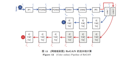 与CNN/GAN不同, GAN包含两部分, 分别是生成器(generator)和判别器(discriminator). Generator负责产生“假"的数据并提供给discriminator, 而discriminator则负责去学习如何辨别出这些“假"的数据. 这两部分被循环训练并且相互竞争. 在GAN的计算中包含一个新的算子叫转置卷积(transposed convolution). 与原来的卷积相比, transposed convolution包含上采样操作并把许多“0"值插入到特征图中. 如果transposed convolution被直接计算, 这无疑将引入许多冗余计算. 除此之外, 如果不存储这些上采样过程中所产生的“0", 那么对非0数据的访存又是极其不规则的. 总之, GAN的加速器必须要支持训练, 为transposed convolution定制计算数据流, 还要优化不规则的数据访存. ReGAN [9]提出了一个基于ReRAM的GAN加速器. 如图 12所示, 一个专门设计的层级流水线被提出来提高系统的吞吐率. 其中, “空间并行" (spatial parallelism)和“共享计算" (computation sharing)两项技术也被提出来进一步提高训练效率. 也有基于CMOS的GAN的加速器设计提出针对GAN的不同计算部分的数据流进行优化. GANAX [34]提出了基于SIMD-MIMD的加速器来提高generator和discriminator的运行效率. SIMD-MIMD的模式主要是用在一些涉及generator的上采样插入“0"的操作加速上, 而单独的SIMD模式则主要用在discriminator的CNN加速上.