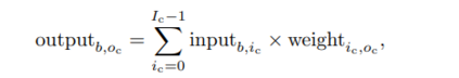 其中 i c 是输入通道的标号, o c 是输出通道的标号( 0 ≤ o c < O c ), b 是批量输入样本中的标号( 0 ≤ b < B ). 在这个矩阵向量乘法中每一个输入可以被所有的输出通道重用, 而每一个权重则可以被所有批量输入重用.