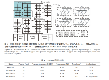 随着NN算法的不断发展, NN的应用不再局限于近似计算. 因此专门为NN的计算设计硬件平台就显得愈发重要. RENO [4]就是一个专为NN定制的硬件加速平台. 如图 5所示, RENO对于PE的功能设计采用了与NPU类似的想法. RENO的PE都是基于ReRAM的交叉阵列(crossbar). RENO利用ReRAM crossbar作为基本的计算单元去处理MVM. 每个PE都有4个ReRAM crossbar去处理正负输入与正负权重所对应的4个MVM. 在RENO中, 数据通路(router)主要用来负责PE之间的数据传输, 即把上一个PE模拟域获得的中间结果传递到下一个PE上去. 在RENO中, 输入和最终的输出是数字信号, 而所有的中间结果都是模拟信号. 因而, 只有当RENO和CPU之间传输数据时才需要DAC和ADC转换电路. 不难看出, 定制的片上加速器作为CPU的辅助单元, 可以帮助CPU高效地处理一些特定的任务. 但由于片上资源的限制(例如面积、功耗等因素), 片上加速器的设计预算有限. 因而其只能用来加速一些例如近似计算、简单的MLP的推理等计算量较小的应用.