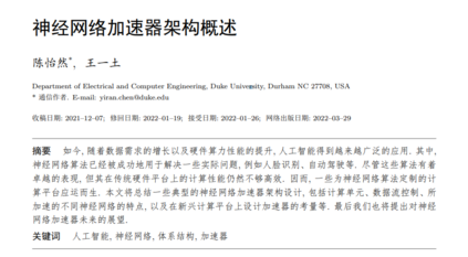 当前, 人工智能(artificial intelligence, AI)已经在生活中无处不在, 例如手机的人脸识别、 汽车的自动驾驶、广告的自动推荐等. AI之所以能被广泛应用, 与三大因素密切相关: 算法、数据与算力. 数据为算法提供“学习"的来源, 也是算法所应用的对象; 硬件则为算法的实际运行提供算力支撑. 但随着摩尔定律(Moore's law)不断逼近物理极限, 传统通用的硬件平台已经难以高效处理AI算法, 特别是复杂的神经网络(neural network, NN)的推理与训练. 因而, 为NN定制硬件加速平台已经成为一个重要并且热门的话题.