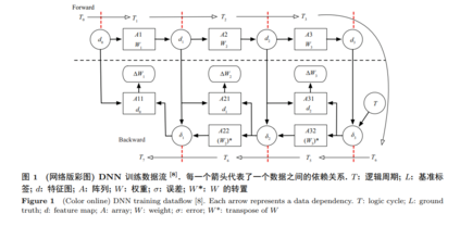 其中 x 为DNN的输入. 由此例可知, 每一层的输出其实只作为下一层的输入, 因而整个DNN的推理过程可以看作是一个链式计算的过程. 在DNN的训练中, 数据的前向传播过程和推理一致, 但其反向传播过程与之相反. 并且前向传播过程中每一层的中间结果都会在反向传播过程中被重新利用来计算误差(这是由于反向传播的链式法则). 这无疑大大加剧了数据之间的依赖性. 图 1 表明了训练与推理过程中的区别. 一个DNN也可能会包含卷积层(convolutional layer), 全连接层(fully connected layer)以及一些其他非线性层(如激活函数ReLU, sigmoid, 池化层(max pooling)以及批标准化层(batch normalization)). 在反向传播过程中, 矩阵乘法以及卷积仍然基本保持其计算模式不变. 细节上的区别是在反向传播过程中, 原来的权重矩阵以转置的形式参与反向传播计算, 而卷积核也以旋转的形式参与梯度下降的计算.