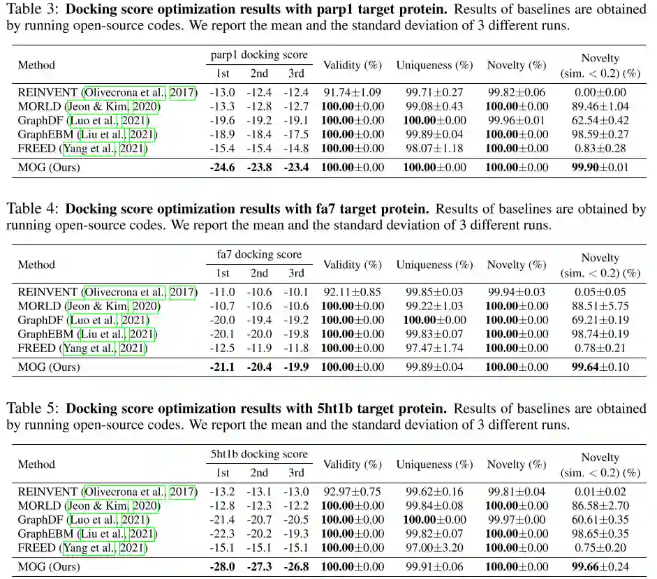 结论: 与基线相比,MOG可以生成具有更高对接分数的分子,同时实现近乎完美的有效性、唯一性和新颖性。上述结果表明,通过能量中心与属性网络结合修改的朗之万动力学方程可以极大地促进了寻找最优解,避免局部最优,从而获得了更高的对接分数。