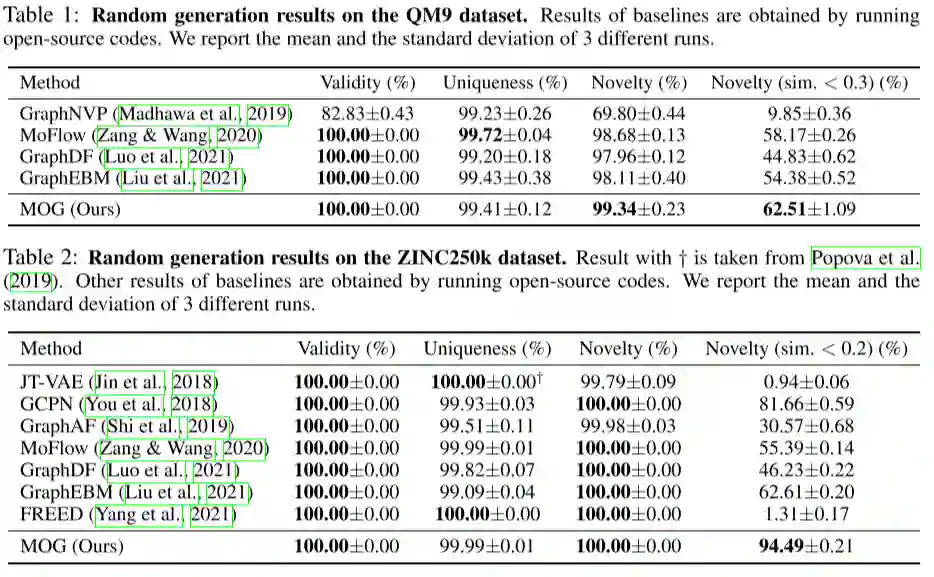 结论: (1)MOG与GraphEBM的模型结构相同,但朗之万动力学方程不同。与GraphEBM相比,MOG新颖性的提高可以归结为多个能量中心的作用。总体结果表明能量增强策略更有利于从训练分子中产生不同的分子。