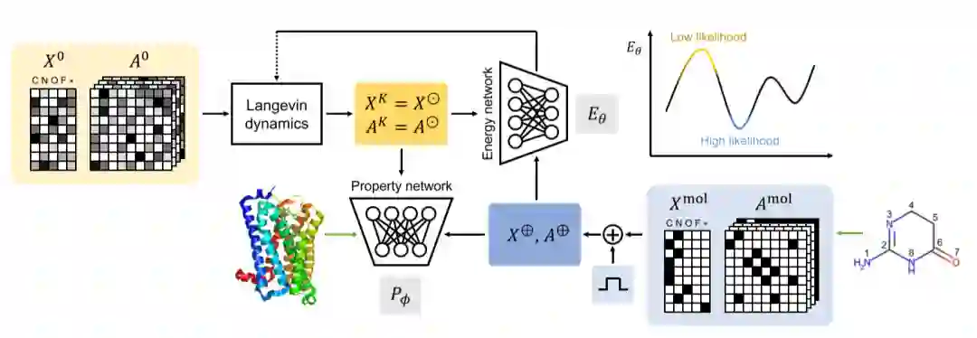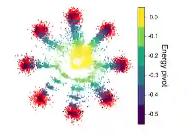 在本文中,作者提出MOG(图1),利用能量模型可以明确生成已知分布外的分子。MOG中修改的朗之万动力学方程更偏向于生成能量值高,靠近能量中心的分子,这意味着把分子推向低似然的区域,从而更大程度探索分子空间。MOG由能量网络和属性网络两个网络组成。作者采用GraphEBM作为能量网络建模分子图的能量函数,从而控制生成的分子的预期似然。属性网络的架构与能量网络架构基本一致,用于预测分子对应某种蛋白靶标的对接分数,从而使得生成的分子性能更优越。两个网络都以真实样本以及经朗之万动力方程处理过的噪声样本作为输入。MOG设置多个能量中心,用不同的能量中心优化每个随机初始化的分子(图2)。