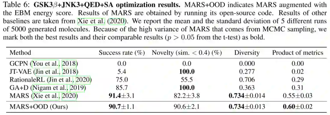 结论: 随着能量分数的增加,MARS模型的新颖性得到了明显的提高,同时具有较高的成功率和多样性。这是因为原始的MARS没有任何约束条件限制生成的分子与已知的活性分子不同,但改良后的MARS考虑了能量分数可以生成分布外的分子。作者表明这种将能量值视为分数或奖励的策略可以很容易地融入到大多数现有模型。