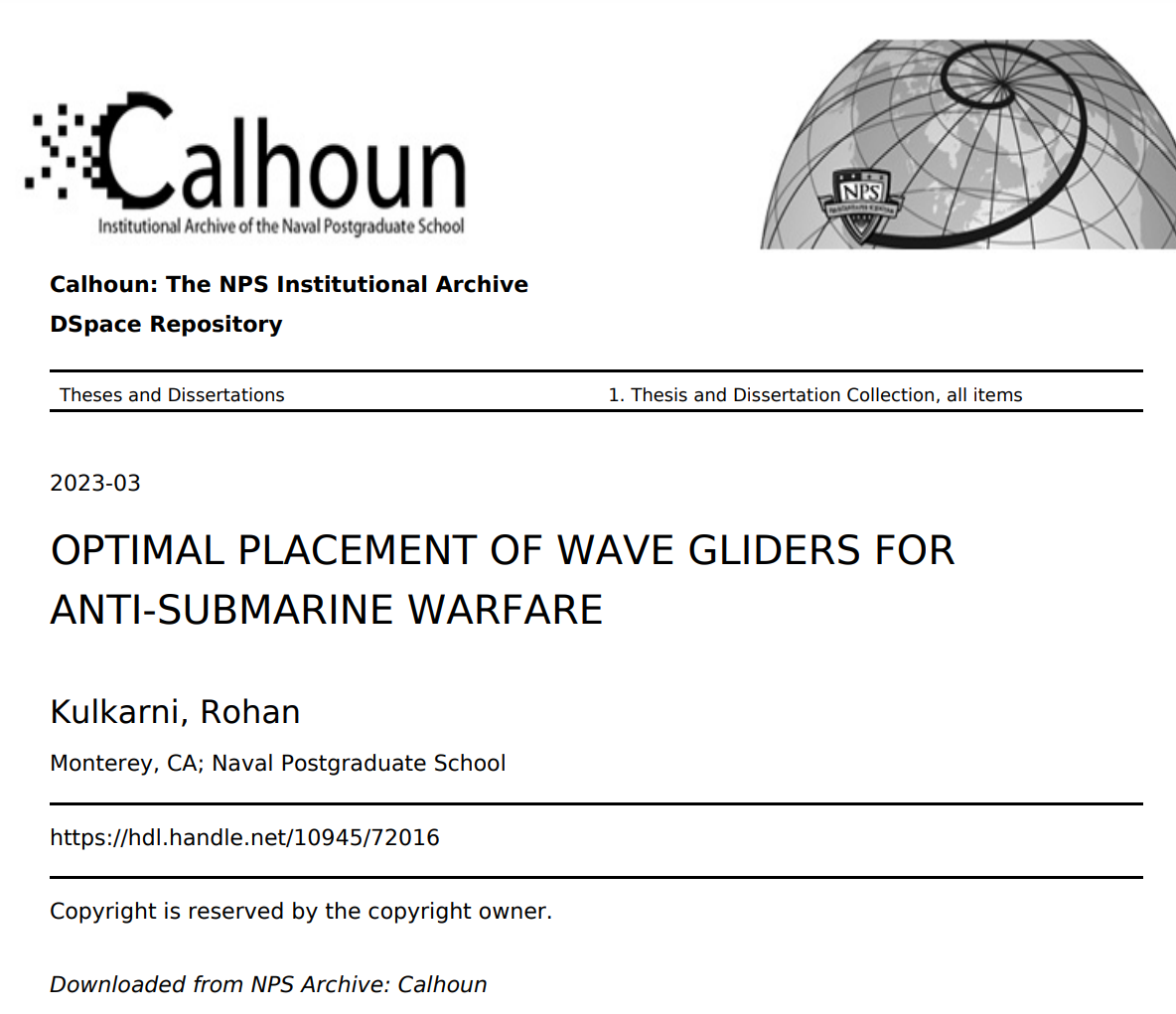 在购置海军平台的资本有限的限制下,需要应对海上挑战。像波浪滑翔机这样的无人平台可能有助于解决这个问题。波浪滑翔机是一种无人水下航行器,它可以配备一个被动阵列,并可以在感兴趣的区域(AOI)保持长时间的部署。它们能够提供分层防御,防止对手在不被发现的情况下穿越该区域,从而提供低成本、持久性的反潜战(ASW)解决方案。在2016年由英国皇家海军领导的 "无人勇士 "演习中,展示了反潜波浪滑翔机成功追踪一艘载人潜艇的能力。然而,如何部署一定数量的波浪滑翔机来探测一艘过境的对手潜艇的问题仍然相对没有被探索。本论文旨在开发一个模型,以确定部署的波浪滑翔机的探测能力,该模型考虑了与探测水下接触有关的变量,在具有声学挑战性的水下环境中使用被动声纳,并在部署无人资产方面受到限制。该模型规定了实现特定探测概率所需的波浪滑翔机的最佳数量,并为其在AOI中的位置提供了参考,以尽量减少对手潜艇穿越该区域而不被发现的概率。