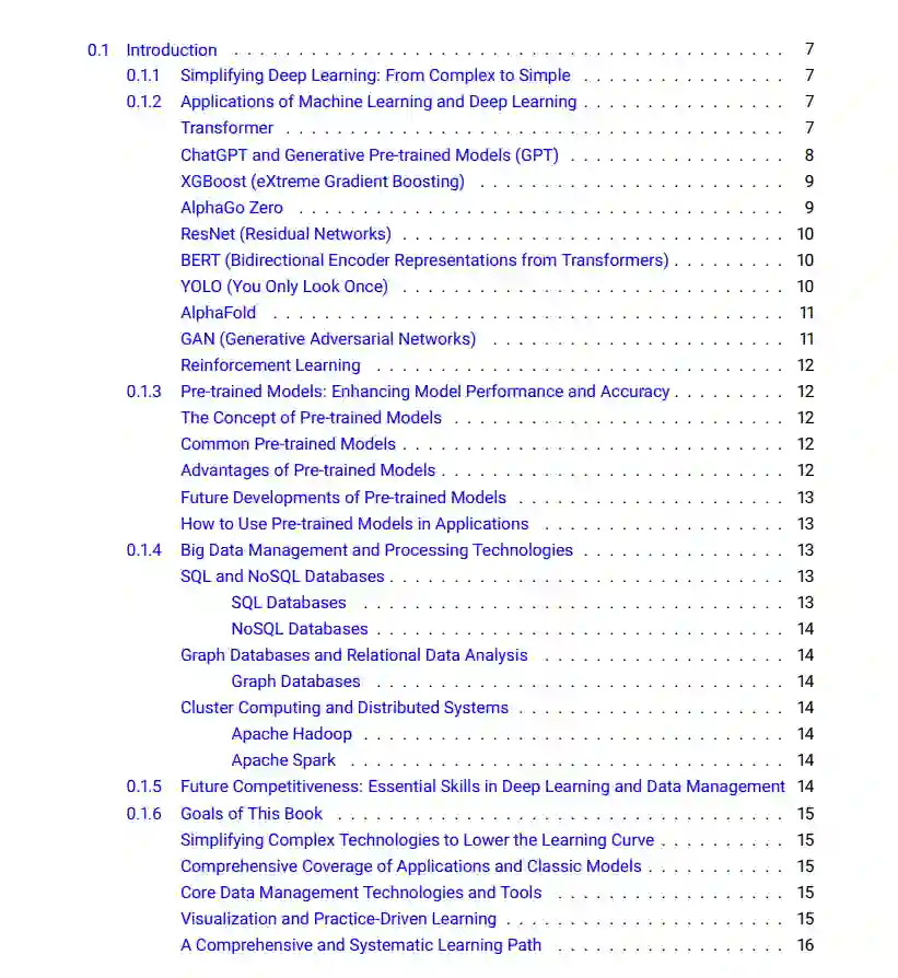 本书探讨了人工智能 (AI)、机器学习 (ML) 和深度学习 (DL) 在推动大数据分析与管理进步中的作用。书中着重简化深度学习背后的复杂数学概念,通过直观的可视化和实际案例研究,帮助读者理解神经网络及卷积神经网络 (CNN) 等技术的工作原理。它介绍了多个经典模型和技术,如 Transformers、GPT、ResNet、BERT 和 YOLO,突出其在自然语言处理、图像识别和自动驾驶等领域的应用。书中还强调了预训练模型的重要性,探讨了如何利用这些模型提升模型性能和准确性,并提供了在各种现实场景中应用这些模型的具体操作指南。此外,书中概述了关键的大数据管理技术,如 SQL 和 NoSQL 数据库,以及分布式计算框架(如 Apache Hadoop 和 Spark),并解释了它们在管理和处理海量数据中的重要性。最后,本书强调掌握深度学习和大数据管理技能作为未来工作力量的关键工具,因而无论是初学者还是有经验的专业人士,都将其视为一项重要资源。