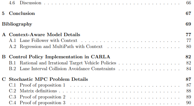 最后,第 4 章考虑了处理不确定预测的替代框架。不是通过自适应置信水平来调整不确定性,而是提出了一种反馈策略方法来提供灵活的行为,这些行为取决于目标车辆行为的未来测量。与传统方法相比,这种方法减少了保守性,传统方法必须选择单个控制输入序列来满足所有可能的目标车辆行为。在 CARLA 模拟器中的交通路口评估反馈策略方法的好处。结果表明,与开环基线方法相比,我们的方法可以提高移动性、舒适性和效率指标。