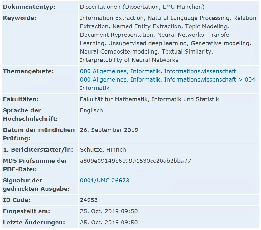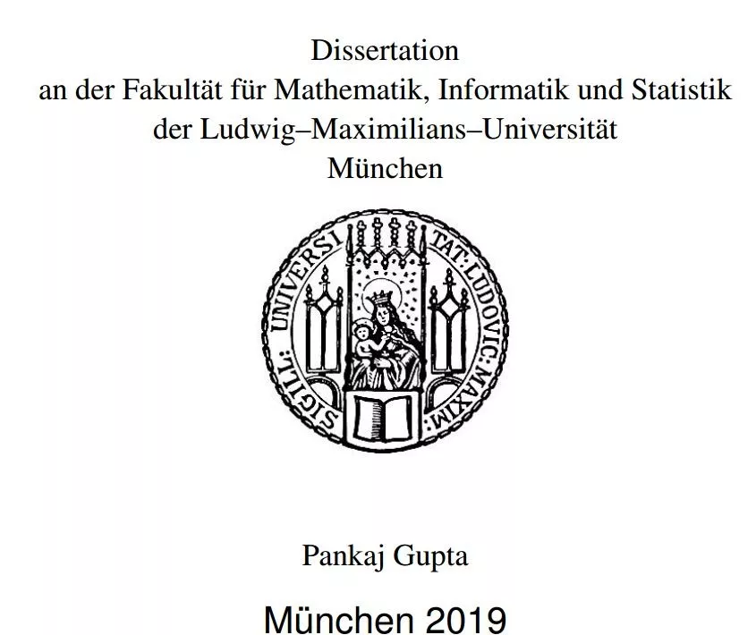 慕尼黑大学自19世纪以来便是德国和欧洲最具声望大学之一,也是德国精英大学、U15大学联盟和欧洲研究型大学联盟成员,其社会科学、人文科学、物理,化学,生命科学,医学,数学等领域均在国际上享有盛名。本文是慕尼黑大学数学、信息学及统计学院的博士生Pankaj Gupta的博士学位论文。
