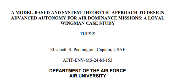 在对抗性空域环境中,决策者间的安全协调至关重要。尽管美国国防部(DoD)将人工智能僚机(AI wingmen)开发列为空战优先事项,但目前缺乏在同一环境中设计人机僚机间安全、整体协调的方法论。本论文提出一种框架,采用系统理论过程分析协调扩展(STPA-Coord)方法,分析并设计空优任务中忠诚僚机(Loyal Wingman)概念的整体协调机制。STPA-Coord是一种基于系统理论的安全与危害分析流程,用于在系统之系统架构中分析与设计决策者间的协调关系。通过该框架,本研究识别出290个损失场景与因果因素,最终提炼出83项适用于忠诚僚机架构的设计考量。