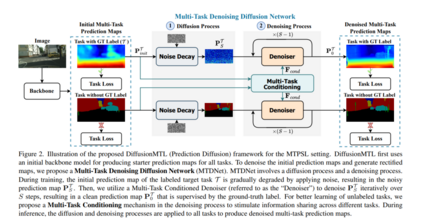 最近,从部分标注数据学习多个密集场景理解任务的实际问题越来越受到关注,其中每个训练样本只为任务子集标注了标签。在训练中缺失任务标签会导致低质量和噪声预测,这一点可以从最新方法中观察到。为了解决这个问题,我们将部分标注的多任务密集预测重新表述为像素级去噪问题,并提出了一种新颖的多任务去噪扩散框架,命名为DiffusionMTL。它设计了一个联合扩散和去噪范式来模拟任务预测或特征图中潜在的噪声分布,并为不同的任务生成校正输出。为了在去噪中利用多任务一致性,我们进一步引入了一种多任务条件策略,该策略可以隐式地利用任务的互补性质来帮助学习未标注的任务,从而提高不同任务的去噪性能。大量的定量和定性实验表明,所提出的多任务去噪扩散模型能显著改善多任务预测图,并在三个具有挑战性的多任务基准测试中,在两种不同的部分标注评估设置下超越最新方法。代码可在 https://prismformore.github.io/diffusionmtl 获取。