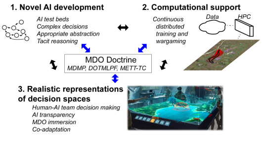 作为美国防部人工智能(AI)战略的一部分,美国陆军作战能力发展司令部(DEVCOM)陆军研究实验室(ARL)正在开发基于人类系统适应战略的研究项目和技术,包括开发基于人-AI团队决策和相互适应的超人能力的目标。这些新能力对于解决陆军的多域作战(MDO)战略是必要的,特别是其渗透和分解阶段,在此期间,人工智能辅助决策可以增强指挥官处理高速和大量信息以及地面、海上、空中、太空和网络领域的复杂动态的能力。一个关键的挑战是,现有的人工智能算法,对于复杂的决策来说是远远不够的,而且对MDO相关场景的概括能力有限。另一个挑战是,现有的陆军理论和决策支持程序没有将人工智能纳入军事决策过程(MDMP),而陆军的自动规划框架(APF)刚刚开始解决这一差距。此外,现有的人-人工智能编队决策理论和技术仅限于简单的决策,为复杂的深度决策在提供人工智能透明度方面非常有限,在这种情况下,多种依赖性、不确定性以及信息领域和行为者与复杂的人类、物资和环境动态相交。它们与人类专家的隐性推理协同工作的能力也很有限。发展这些能力需要一个综合的、多学科的研究方法,包括为新的人工智能研究和人类与人工智能的编队协作开发人工智能试验基地。