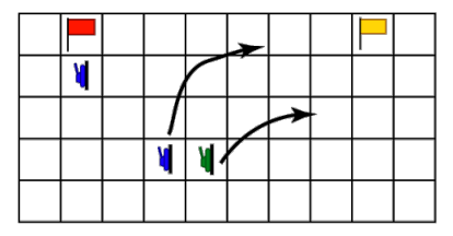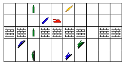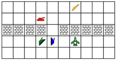 目前各单位的规则和行动如下。士兵、坦克和卡车都有一个目标,描述他们的导向。他们的行动包括 "什么都不做(doNothing)"、"转向(turnH)"、"前进1(advance1)"、"射击(shoot)"和"冲撞(ram)"。"doNothing"意味着该单位停留在他们的位置,不改变他们的状态。"turnH"将单位的方向旋转H度,其中H∈{-135,-90,- 45,45,90,135,180}。"advance1 "使其方向上向前移动一个单元。"shoot"向单位的方向射出一个弹丸,弹丸继续向前推进一个单元,直到它与另一个单位相撞或在游戏盘外飞行。最后,"ram"行动使单位在其方向上向前推进一格,同时进行攻击。与 "advance1"行动相比,"ram"行动总是有利的,因为攻击可以消灭敌方单位。