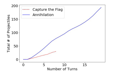两种游戏的另一个区别是,夺旗游戏的总回合数要比歼灭游戏少得多。这是因为人类Agent找到旗子的速度比他们找到敌方单位并消灭它们的速度要快。