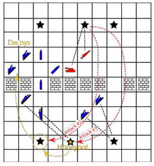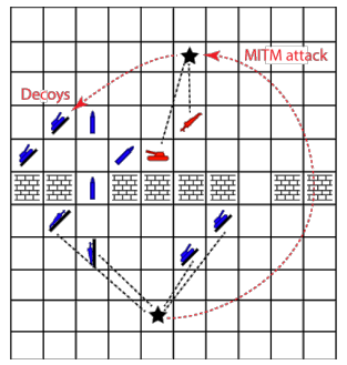 在人类的决策中,来自不同领域的信息可以结合起来,产生意想不到的效果。心理上的McGurk效应是指口型"ga"和听觉上的音节"ba"在时间上有很强的同步性,从而产生幻觉"da"。虽然多感官整合似乎没有在C2决策中得到探索,但MDO中多个领域的汇合,特别是其在穿透和分解整合阶段的高容量和高速度,可能会产生意想不到的非线性跨领域的相互作用(这可能有助于"战争迷雾")。图11说明了一个例子,在这个例子中,实际迹象(导弹)和坦克诱饵(由中间人[MITM]网络攻击产生)的组合可以协同作用,迫使敌方单位向左侧缺口移动。为网络欺骗创造趋同的迹象线是一种普遍的策略,然而特定的欺骗模式可能比其他模式更有效。例如,人们认为大脑会将相似或相关的迹象分组,以进行有效的处理(如格式塔分组),这样就可以克服信息瓶颈(如处理七个以上的名义项目,从而减少单个项目的影响)。如果进行每一次网络攻击都会产生一定的成本或风险,那么了解如何将这些成本分配到不同的线索特征中,以便以最小的风险提供最有效的影响可能是有益的(例如,如果MITM攻击产生导弹诱饵,那么它的效果可能会降低,甚至是反作用)。了解不同的线索组合如何被不同的士兵所感知,也可能是有意义的。具有不同偏见或处于不同角色或梯队的指挥官可能对相同的迹象组合有不同的感知、解释或行动(例如,一个诱饵的有效性可能取决于它与目标指挥官的距离以及与他的决策过程的相关性)。更高级的策略可能包括主动防御(例如,通过 "蜜罐 "策略[图12]),以提高网络欺骗的有效性。为了给MDO提供超人的能力,人工智能决策辅助工具可能需要根据即时可用的迹象在多个领域协助生成可信的诱饵,以网络的速度迅速调整这些展示,并保持虚拟和现实世界之间的一致性,以保持幻觉的有效性。