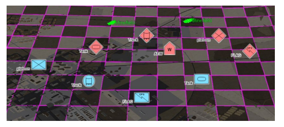 图15 BVI网络战术规划器中带有网格覆盖的兵棋推演场景的三维视图